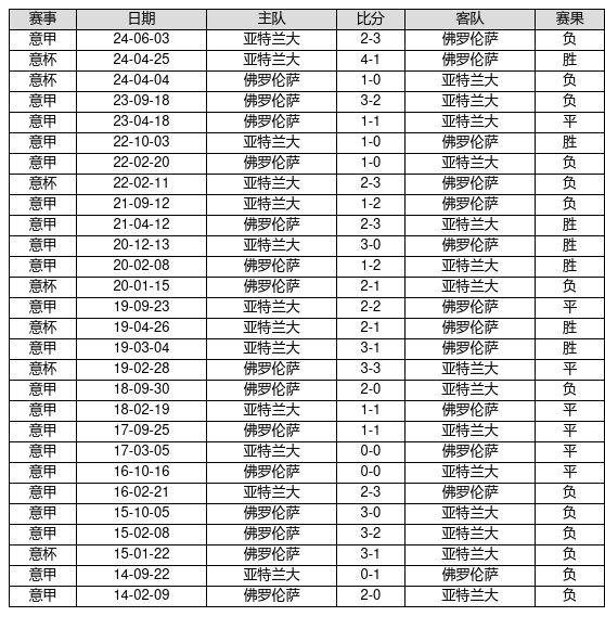 亚特兰大 VS 佛罗伦萨两队近10年的交战次数为28场,亚特兰大7胜7平14负,赢球概率为25.0%,平局概率为25.0%,输球概率为50.0%。