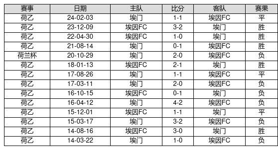 埃因FC VS 埃门两队近10年的交战次数为14场,埃因FC5胜3平6负,赢球概率为35.7%,平局概率为21.4%,输球概率为42.9%。