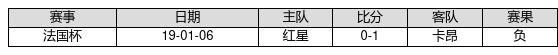 红星 VS 卡昂两队近10年的交战次数为1场,红星0胜0平1负,赢球概率为0.0%,平局概率为0.0%,输球概率为100.0%。