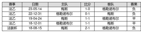 格勒诺布尔 VS 梅斯两队近10年的交战次数为5场,格勒诺布尔0胜2平3负,赢球概率为0.0%,平局概率为40.0%,输球概率为60.0%。