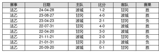 甘冈 VS 波城两队近10年的交战次数为8场,甘冈5胜0平3负,赢球概率为62.5%,平局概率为0.0%,输球概率为37.5%。