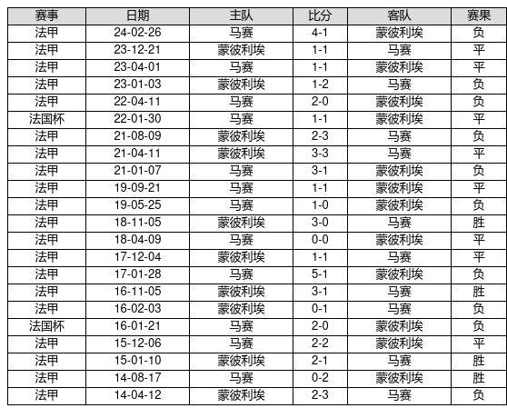 蒙彼利埃 VS 马赛两队近10年的交战次数为22场,蒙彼利埃4胜8平10负,赢球概率为18.2%,平局概率为36.4%,输球概率为45.5%。