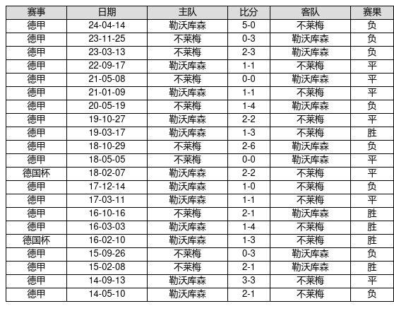 不莱梅 VS 勒沃库森两队近10年的交战次数为21场,不莱梅5胜8平8负,赢球概率为23.8%,平局概率为38.1%,输球概率为38.1%。