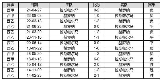 拉斯帕尔马 VS 赫罗纳两队近10年的交战次数为13场,拉斯帕尔马3胜3平7负,赢球概率为23.1%,平局概率为23.1%,输球概率为53.8%。