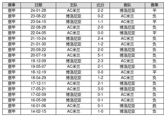 博洛尼亚 VS AC米兰两队近10年的交战次数为19场,博洛尼亚1胜4平14负,赢球概率为5.3%,平局概率为21.1%,输球概率为73.7%。