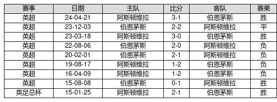 阿斯顿维拉 VS 伯恩茅斯两队近10年的交战次数为9场,阿斯顿维拉4胜1平4负,赢球概率为44.4%,平局概率为11.1%,输球概率为44.4%。