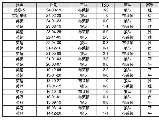 布莱顿 VS 狼队两队近10年的交战次数为20场,布莱顿8胜8平4负,赢球概率为40.0%,平局概率为40.0%,输球概率为20.0%。