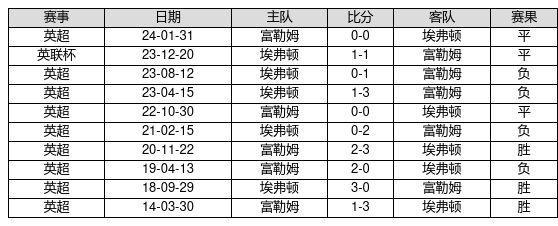 埃弗顿 VS 富勒姆两队近10年的交战次数为10场,埃弗顿3胜3平4负,赢球概率为30.0%,平局概率为30.0%,输球概率为40.0%。