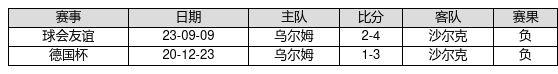 乌尔姆 VS 沙尔克两队近10年的交战次数为2场,乌尔姆0胜0平2负,赢球概率为0.0%,平局概率为0.0%,输球概率为100.0%。