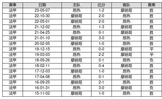 摩纳哥 VS 昂热两队近10年的交战次数为16场,摩纳哥12胜2平2负,赢球概率为75.0%,平局概率为12.5%,输球概率为12.5%。