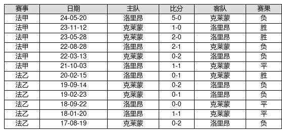 克莱蒙 VS 洛里昂两队近10年的交战次数为12场,克莱蒙3胜3平6负,赢球概率为25.0%,平局概率为25.0%,输球概率为50.0%。