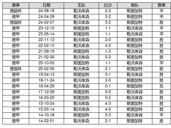 勒沃库森 VS 斯图加特两队近10年的交战次数为20场,勒沃库森13胜6平1负,赢球概率为65.0%,平局概率为30.0%,输球概率为5.0%。