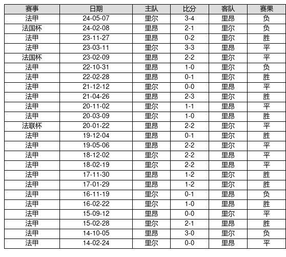 里尔 VS 里昂两队近10年的交战次数为24场,里尔9胜10平5负,赢球概率为37.5%,平局概率为41.7%,输球概率为20.8%。
