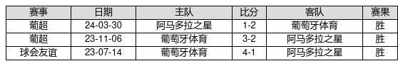 葡萄牙体育 VS 阿马多拉之星两队近10年的交战次数为3场,葡萄牙体育3胜0平0负,赢球概率为100.0%,平局概率为0.0%,输球概率为0.0%。