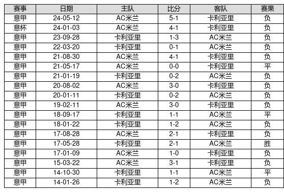 卡利亚里 VS AC米兰两队近10年的交战次数为18场,卡利亚里1胜3平14负,赢球概率为5.6%,平局概率为16.7%,输球概率为77.8%。