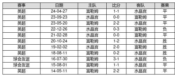水晶宫 VS 富勒姆两队近10年的交战次数为11场,水晶宫3胜6平2负,赢球概率为27.3%,平局概率为54.5%,输球概率为18.2%。