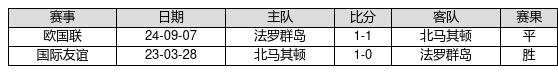 北马其顿 VS 法罗群岛两队近10年的交战次数为2场,北马其顿1胜1平0负,赢球概率为50.0%,平局概率为50.0%,输球概率为0.0%。