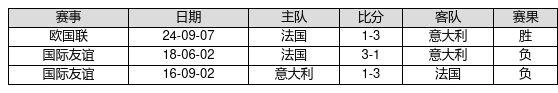 意大利 VS 法国两队近10年的交战次数为3场,意大利1胜0平2负,赢球概率为33.3%,平局概率为0.0%,输球概率为66.7%。