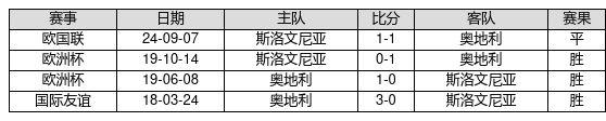 奥地利 VS 斯洛文尼亚两队近10年的交战次数为4场,奥地利3胜1平0负,赢球概率为75.0%,平局概率为25.0%,输球概率为0.0%。