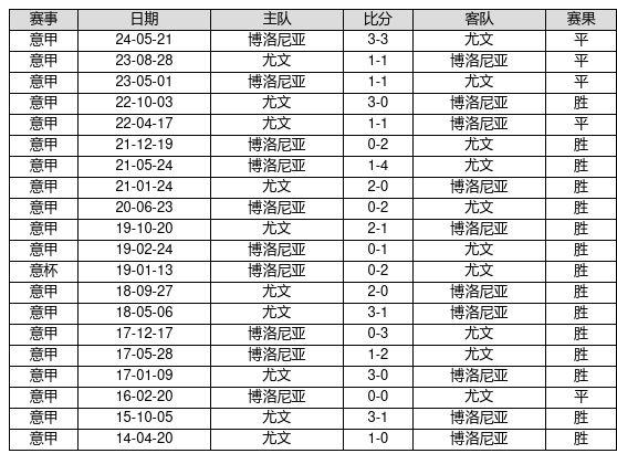 尤文 VS 博洛尼亚两队近10年的交战次数为20场,尤文15胜5平0负,赢球概率为75.0%,平局概率为25.0%,输球概率为0.0%。