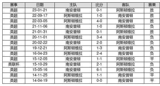阿斯顿维拉 VS 南安普顿两队近10年的交战次数为14场,阿斯顿维拉4胜3平7负,赢球概率为28.6%,平局概率为21.4%,输球概率为50.0%。
