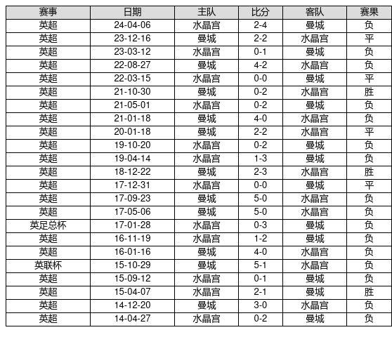 水晶宫 VS 曼城两队近10年的交战次数为23场,水晶宫3胜4平16负,赢球概率为13.0%,平局概率为17.4%,输球概率为69.6%。