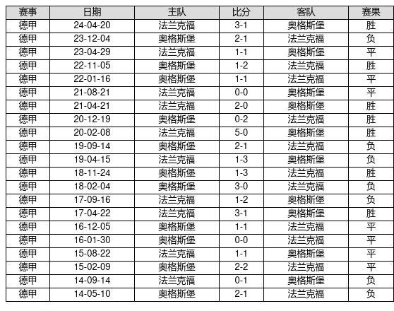 法兰克福 VS 奥格斯堡两队近10年的交战次数为21场,法兰克福7胜7平7负,赢球概率为33.3%,平局概率为33.3%,输球概率为33.3%。