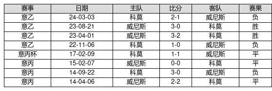 威尼斯 VS 科莫两队近10年的交战次数为8场,威尼斯2胜3平3负,赢球概率为25.0%,平局概率为37.5%,输球概率为37.5%。