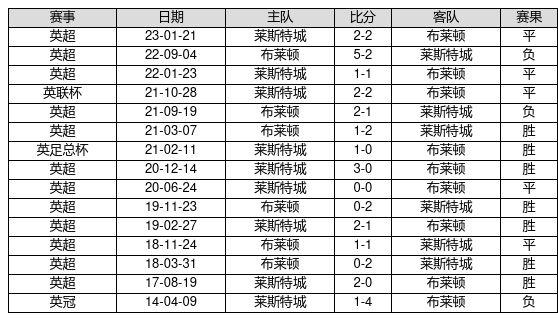 莱斯特城 VS 布莱顿两队近10年的交战次数为15场,莱斯特城7胜5平3负,赢球概率为46.7%,平局概率为33.3%,输球概率为20.0%。
