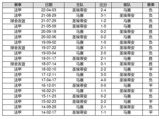圣埃蒂安 VS 马赛两队近10年的交战次数为20场,圣埃蒂安4胜5平11负,赢球概率为20.0%,平局概率为25.0%,输球概率为55.0%。