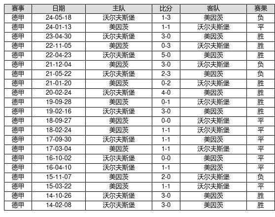 沃尔夫斯堡 VS 美因茨两队近10年的交战次数为21场,沃尔夫斯堡9胜8平4负,赢球概率为42.9%,平局概率为38.1%,输球概率为19.0%。