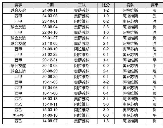 奥萨苏纳 VS 阿拉维斯两队近10年的交战次数为21场,奥萨苏纳11胜3平7负,赢球概率为52.4%,平局概率为14.3%,输球概率为33.3%。