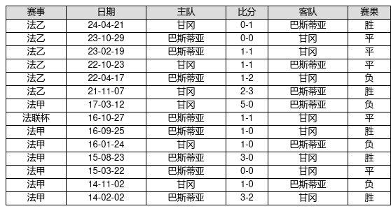 巴斯蒂亚 VS 甘冈两队近10年的交战次数为14场,巴斯蒂亚5胜5平4负,赢球概率为35.7%,平局概率为35.7%,输球概率为28.6%。
