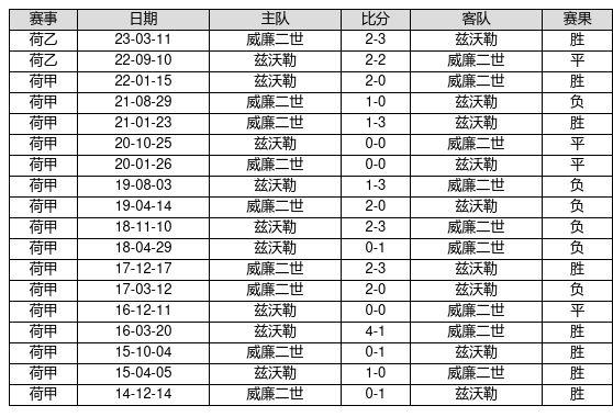 兹沃勒 VS 威廉二世两队近10年的交战次数为18场,兹沃勒8胜4平6负,赢球概率为44.4%,平局概率为22.2%,输球概率为33.3%。