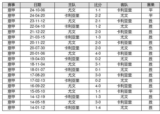 尤文 VS 卡利亚里两队近10年的交战次数为19场,尤文15胜3平1负,赢球概率为78.9%,平局概率为15.8%,输球概率为5.3%。