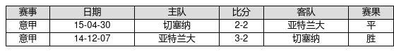 亚特兰大 VS 切塞纳两队近10年的交战次数为2场,亚特兰大1胜1平0负,赢球概率为50.0%,平局概率为50.0%,输球概率为0.0%。