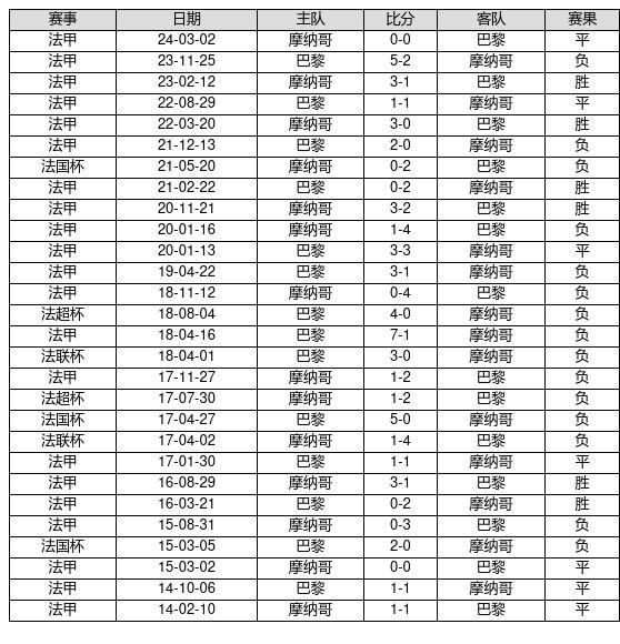 摩纳哥 VS 巴黎两队近10年的交战次数为28场,摩纳哥6胜7平15负,赢球概率为21.4%,平局概率为25.0%,输球概率为53.6%。