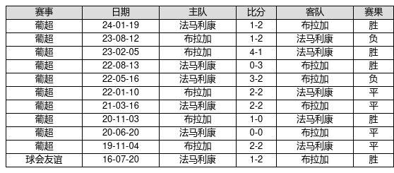 布拉加 VS 法马利康两队近10年的交战次数为11场,布拉加5胜4平2负,赢球概率为45.5%,平局概率为36.4%,输球概率为18.2%。