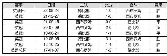 德比郡 VS 西布罗姆两队近10年的交战次数为8场,德比郡5胜2平1负,赢球概率为62.5%,平局概率为25.0%,输球概率为12.5%。