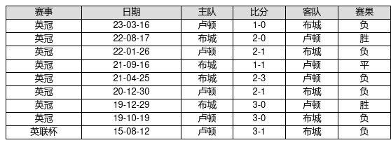 布城 VS 卢顿两队近10年的交战次数为9场,布城2胜1平6负,赢球概率为22.2%,平局概率为11.1%,输球概率为66.7%。