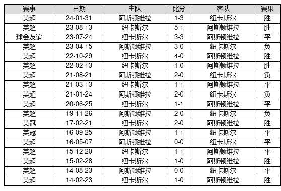 纽卡斯尔 VS 阿斯顿维拉两队近10年的交战次数为18场,纽卡斯尔7胜7平4负,赢球概率为38.9%,平局概率为38.9%,输球概率为22.2%。