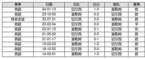 切尔西 VS 富勒姆两队近10年的交战次数为10场,切尔西8胜1平1负,赢球概率为80.0%,平局概率为10.0%,输球概率为10.0%。