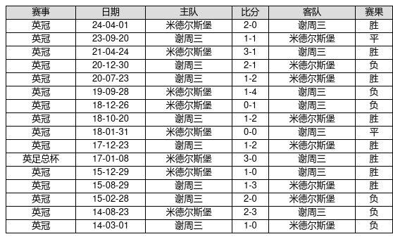 米德尔斯堡 VS 谢周三两队近10年的交战次数为16场,米德尔斯堡8胜2平6负,赢球概率为50.0%,平局概率为12.5%,输球概率为37.5%。