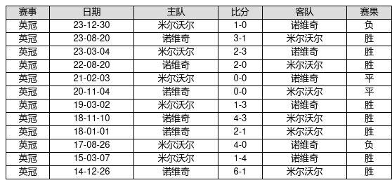 诺维奇 VS 米尔沃尔两队近10年的交战次数为12场,诺维奇8胜2平2负,赢球概率为66.7%,平局概率为16.7%,输球概率为16.7%。