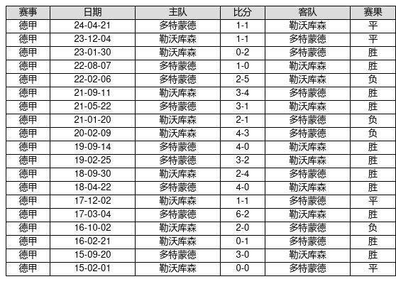 多特蒙德 VS 勒沃库森两队近10年的交战次数为19场,多特蒙德11胜4平4负,赢球概率为57.9%,平局概率为21.1%,输球概率为21.1%。