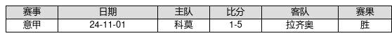 拉齐奥 VS 科莫两队近10年的交战次数为1场,拉齐奥1胜0平0负,赢球概率为100.0%,平局概率为0.0%,输球概率为0.0%。