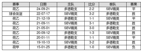 SBV精英 VS 多德勒支两队近10年的交战次数为9场,SBV精英5胜3平1负,赢球概率为55.6%,平局概率为33.3%,输球概率为11.1%。