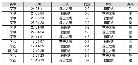 福图纳 VS 前进之鹰两队近10年的交战次数为12场,福图纳6胜1平5负,赢球概率为50.0%,平局概率为8.3%,输球概率为41.7%。