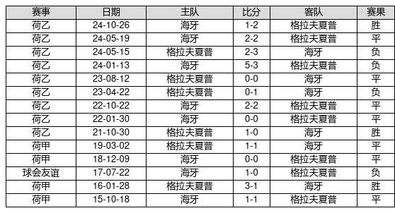 格拉夫夏普 VS 海牙两队近10年的交战次数为14场,格拉夫夏普3胜7平4负,赢球概率为21.4%,平局概率为50.0%,输球概率为28.6%。