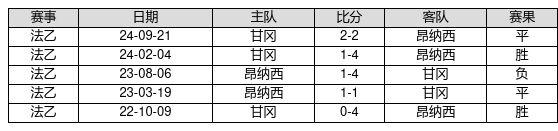 昂纳西 VS 甘冈两队近10年的交战次数为5场,昂纳西2胜2平1负,赢球概率为40.0%,平局概率为40.0%,输球概率为20.0%。